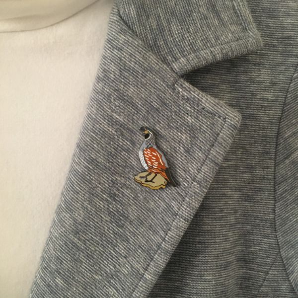 There are few birds more charismatic than the California Quail, which also happens to be the official State Bird of California! This charming lapel pin measures 1.125" wide.