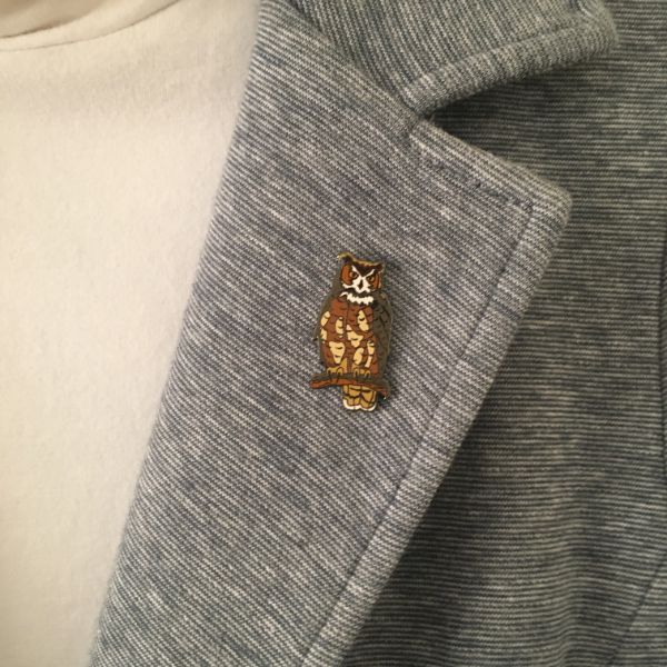 Great Horned Owls hide in dense trees during the day and fly silently at night, making them hard to spot. But you probably know their classic, haunting call, often heard in the evening or just before dawn. This lovely enamel lapel pin measures 1.25" wide.