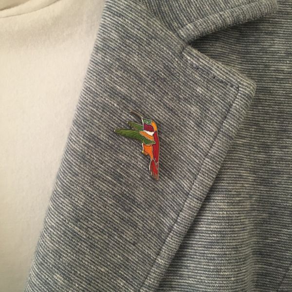 These tiny, jewel-like birds can be spotted in the Santa Cruz area early in the spring, when the males start courting females for the breeding season. This colorful enamel lapel pin measures 1.25" wide.