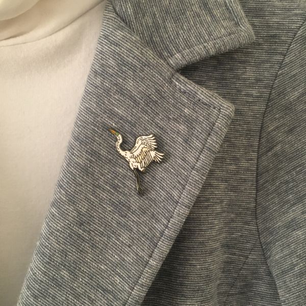These tall, elegant birds can often be spotted in the pond next to the butterfly grove at Natural Bridges State Beach, and you can also sometimes spot them fishing the kelp beds just off shore! This beautiful lapel pin measures 1.5" wide.